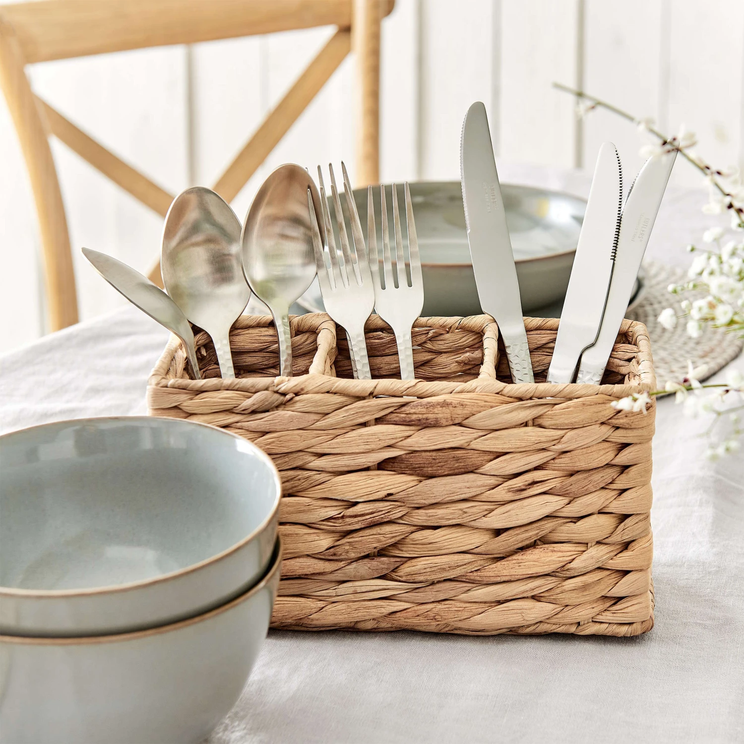 Förmlich war gestern: Zum BBQ oder Brunch bringen Sie das Besteck jetzt ganz unkompliziert auf den Tisch im Rush Rope Besteckkorb natur aus Wasserhyazinthe. Drei Fächer bieten Platz und Ordnung für Messer, Gabel, Löffel zum Selbstbedienen – oder Sie wickeln das Besteck vorher in Servietten und füllen alle drei Fächer mit solchen Sets to go.