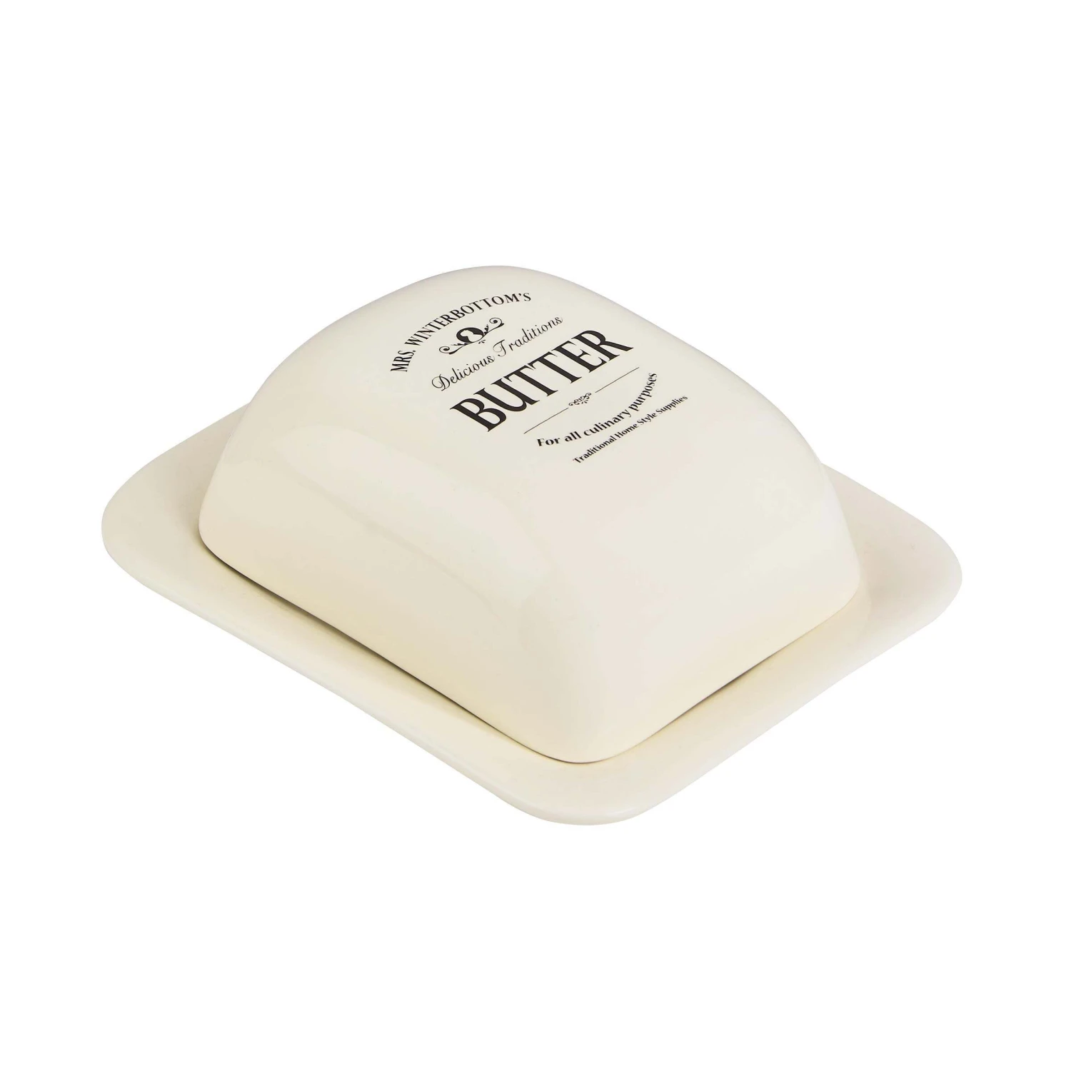 Die Butterdose: Traditioneller geht es kaum. In schlichtem Creme-Weiß und mit einem Hauch von Vintage Flair steht die Keramikdose unserer Mrs. Winterbottom’s Serie klassisch auf dem Frühstückstisch zu frischen Brötchen, duftendem Kaffee, Marmelade, Aufstrich und Orangensaft. Auf dem gedeckten Tisch darf die Aufbewahrungsdose nicht fehlen und bietet sich mit ihrer abgerundeten Form und dem passenden Deckel auch als schönes Accessoire in Küche und Esszimmer an.