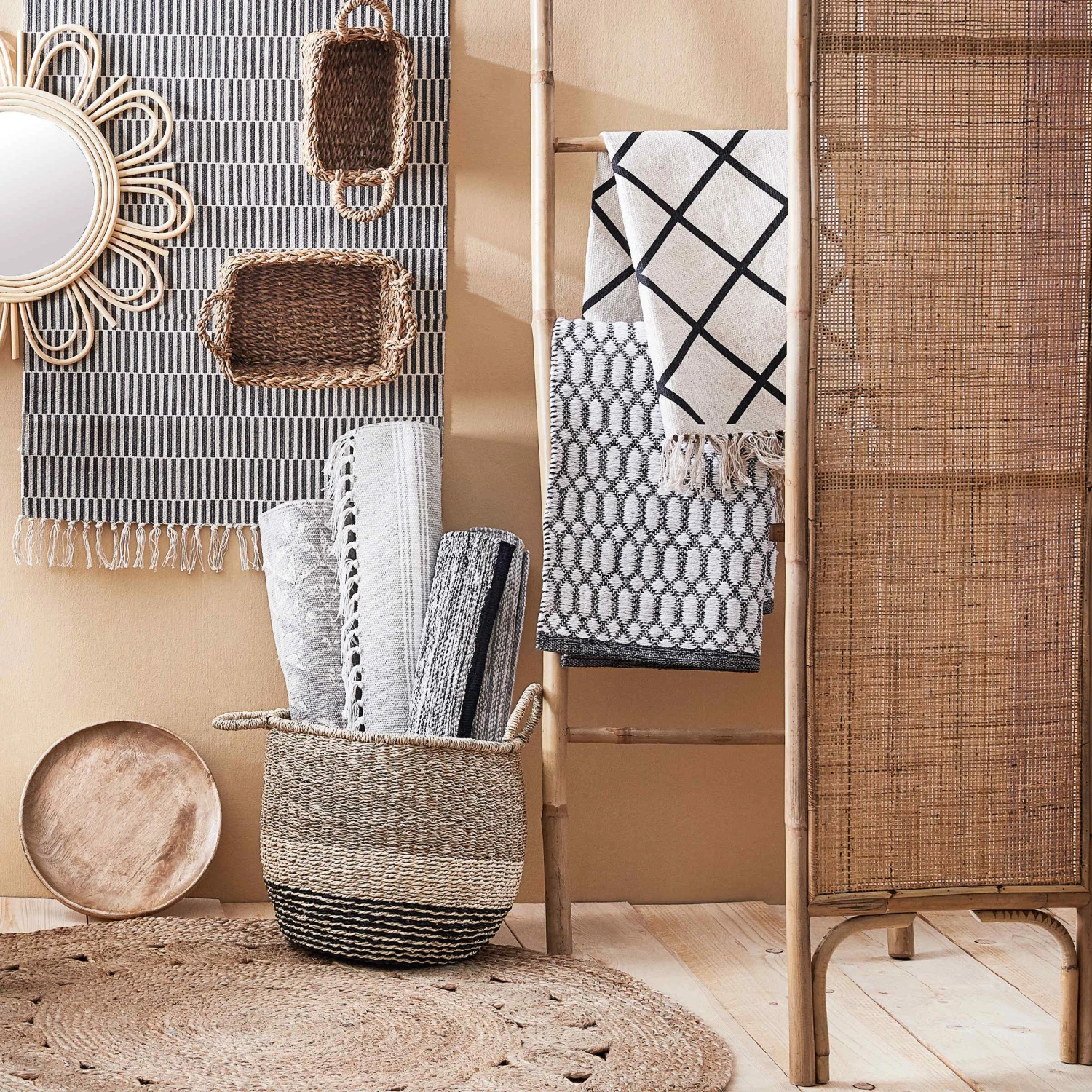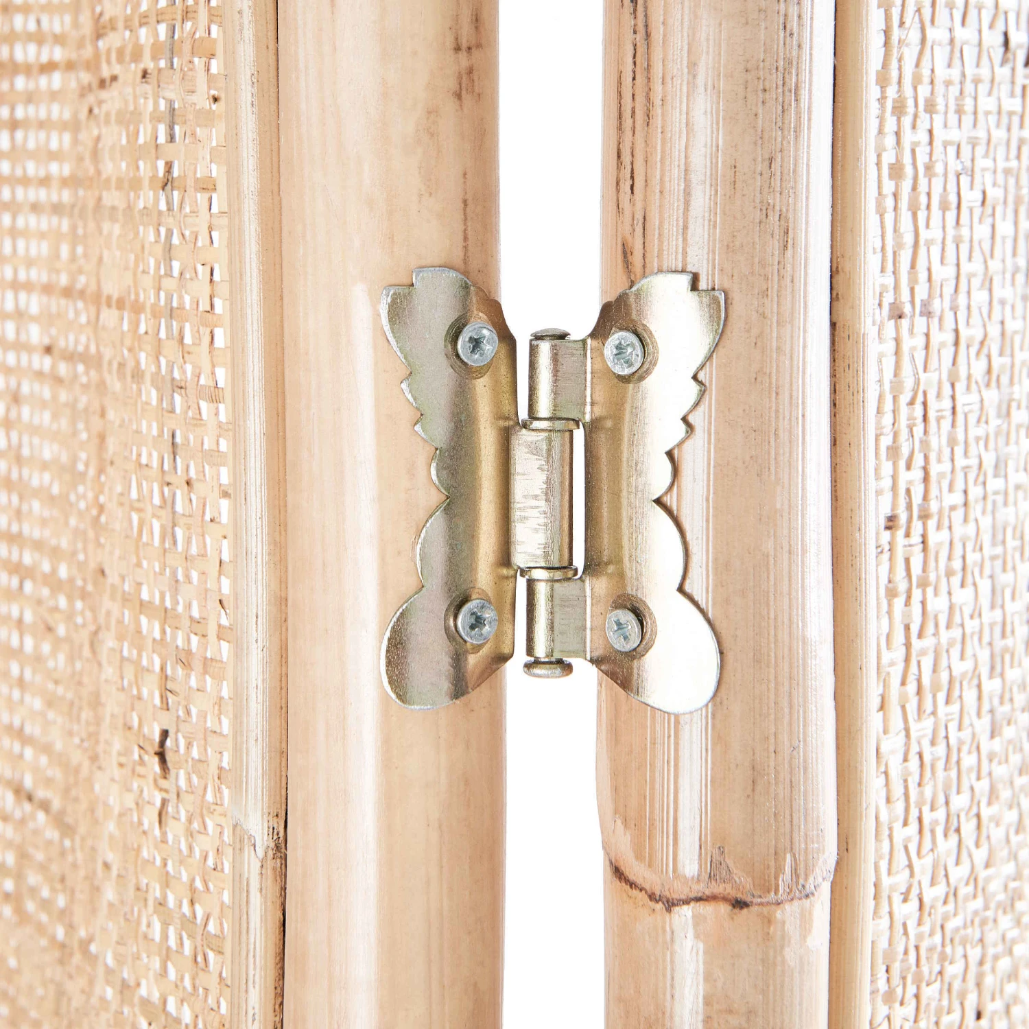 Räume unterteilen, Privatsphäre schaffen oder einen Blickfang setzen: Mit dem dreiflügeligen Boho Lounge Rattan-Paravent gelingt es Ihnen mit Leichtigkeit. Die geflochtenen, halbtransparenten Flächen schirmen Blicke und Licht ab, während die gerundeten Formen und dekorativen Scharniere als Hingucker wirken. Je nach Bedarf stellen Sie das Möbel flexibel mal hier, mal da auf oder klappen es platzsparend zusammen: Der dekorative Paravent ist einfach immer zur Stelle oder aus dem Weg.