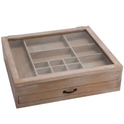 Muscheln, Edelsteine, Fossilien, Fingerhüte, Miniaturfiguren – es gibt so viele Kleinigkeiten, für die sich das Sammlerherz begeistern kann. Gut aufgehoben und schön präsentiert sind Ihre Lieblingsobjekte in diesem Setzkasten. Er enthält zwei Ebenen, beide in verschieden große Fächer unterteilt. Die obere Ebene ist durch einen Glasdeckel (zum Klappen) geschützt, die untere lässt sich wie eine Schublade herausziehen. Damit erinnert der Setzkasten an die Ausrüstung, mit deren Hilfe die Forscher früher ihre Schätze archivierten.